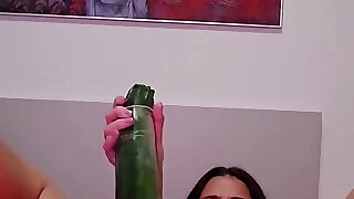 A kinky amateur brunette babe fucks her moist cootchie with a table spoon and with a bottle