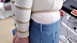 Stunner is bound up and gets her boobs exposed by another girl as she fucktoys with her when there's nothing the lady can do