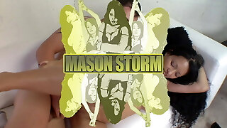 Big tits latina Mason Storm gets a huge explosion of cum in her open mouth