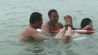 Oriental girl gets lubed up and tied with rope before intense sex toy fuck