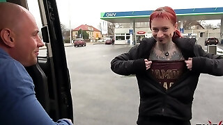Totally Pierced and Tatted Wierd Creature Rock the Cock in Driving Van