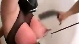 Poor bdsm slave female gets her giant tits tortured with straps in basement