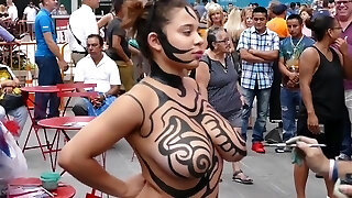 Big tits girl public body painting
