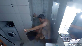 Housewife does make-up in the shower. The stranger fucks the lady. Cam 1